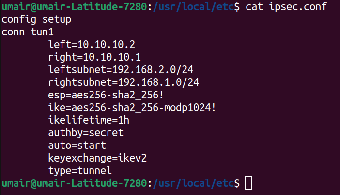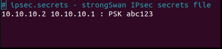 This file defines the secrets that will be used throughtout the IPsec process. In our specific case, we will use this file to store the ‘shared secret’ used between peers to authenticate each other. Below are snippets of this file on both Debian gateways. Following are the content of ‘ipsec.secrets’ file at ‘/usr/local/etc’ of both VMs. On ‘VM Debian Gateway 2’