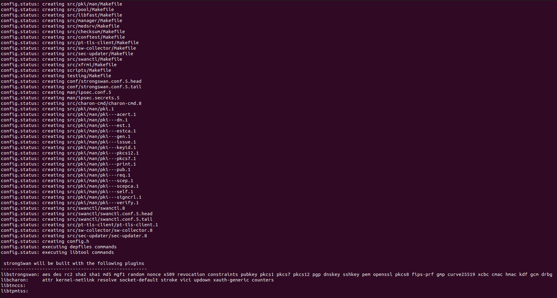 Now we run the configure script of Strongswan. Here we can choose different functionalities including plugins that we want to include or exclude from our build. We can also use the ‘–help’ option to see details of various configurable options. In our case, we’ll only include the ‘openssl’ plugin as follows;